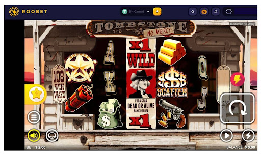 Screenshot of Tombstone: No Mercy slot with Wild West symbols like a badge, dynamite, and a gun