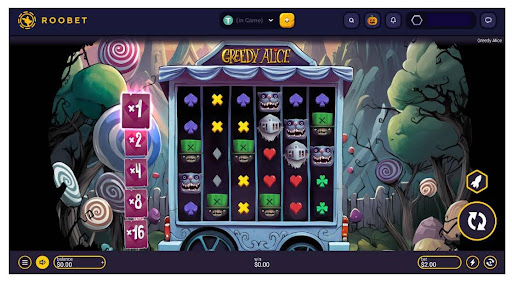 Screenshot of Greedy Alice with a bright carnival grid and multiplier icons